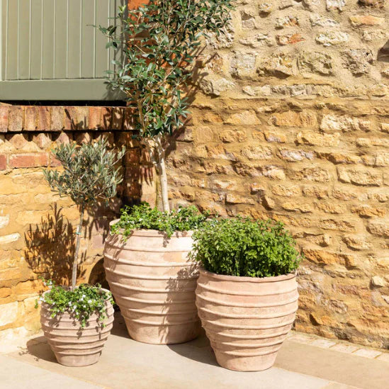 Our Aged Ribbed Terracotta Planters are beautifully crafted pieces that bring a sense of timeless elegance to your garden or home. Made from natural terracotta, these planters feature a subtle ribbed texture and an aged finish that evoke a classic, weathered look.